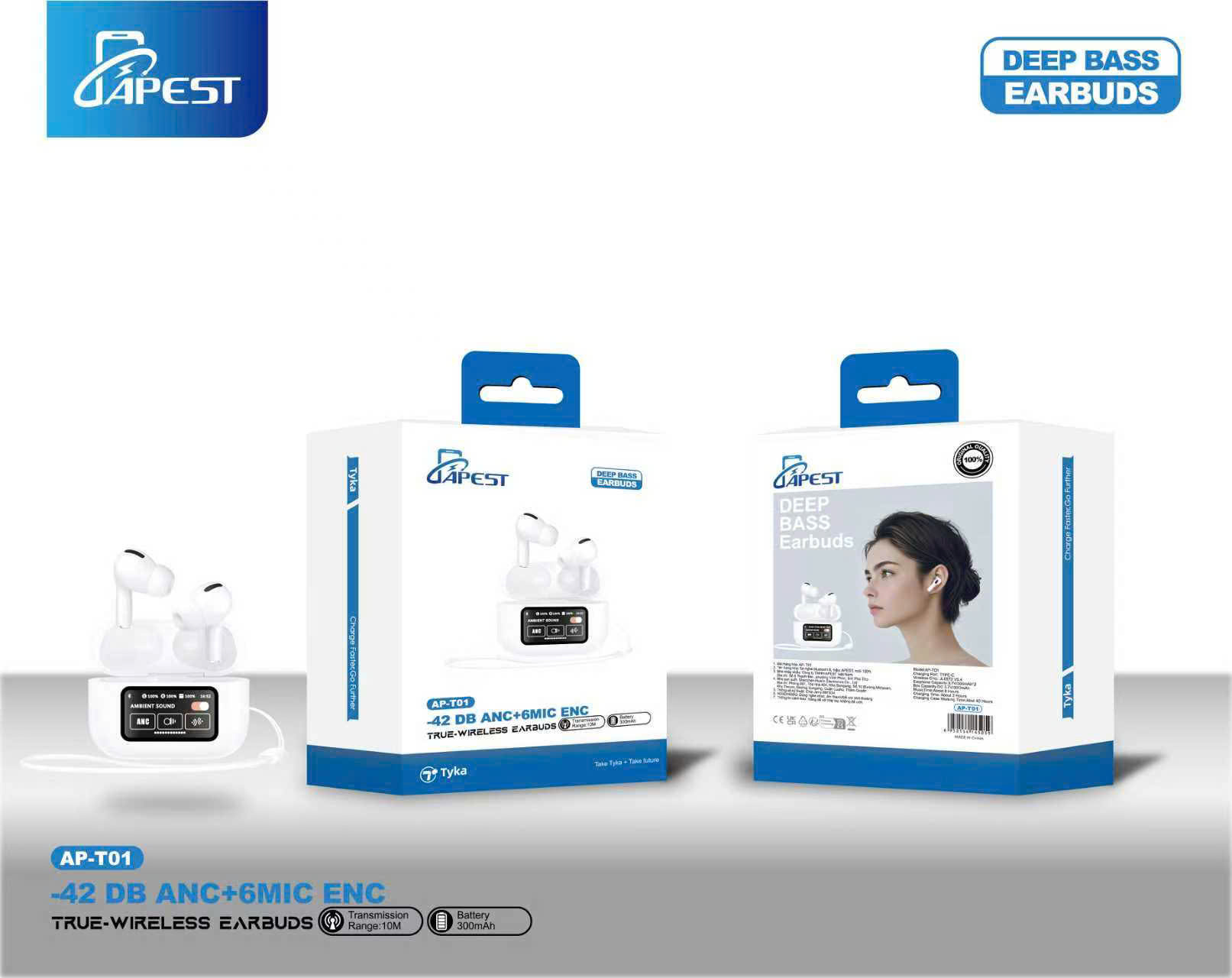 Tai nghe Bluetooth APEST AP-T01 – ANC -42dB, 6Mic ENC, hộp sạc có màn hình cảm ứng